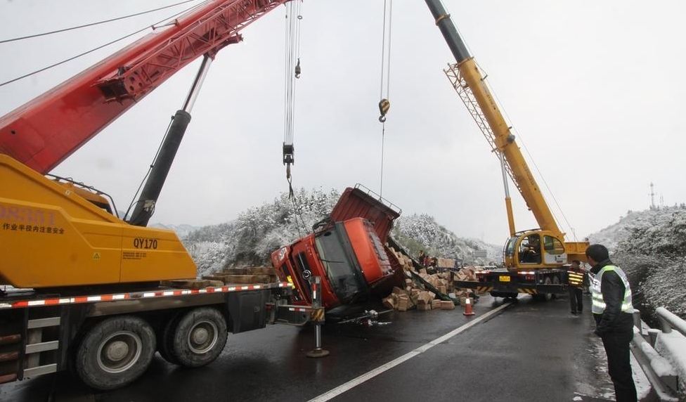 雪后路面结冰,杭新景大货车侧翻