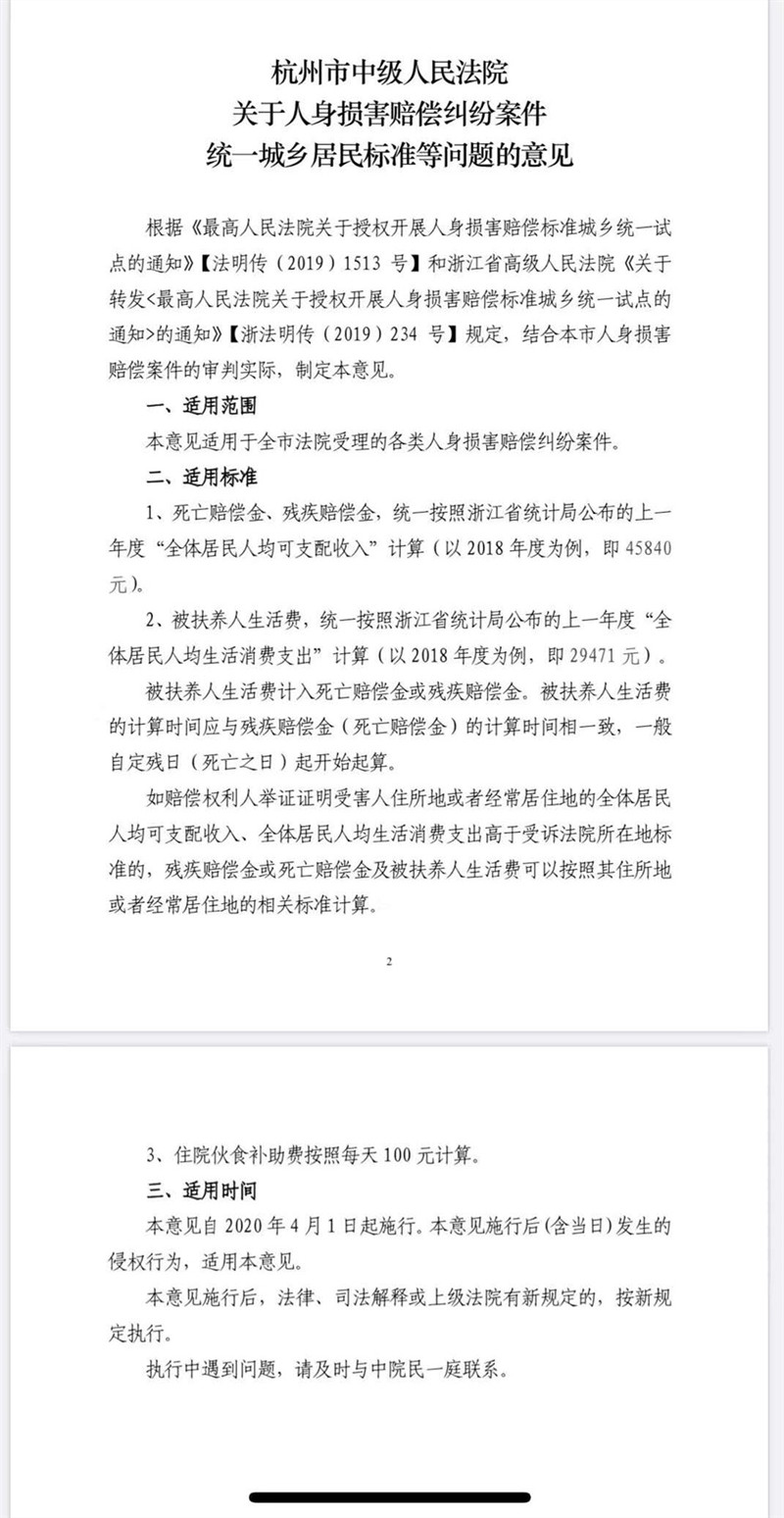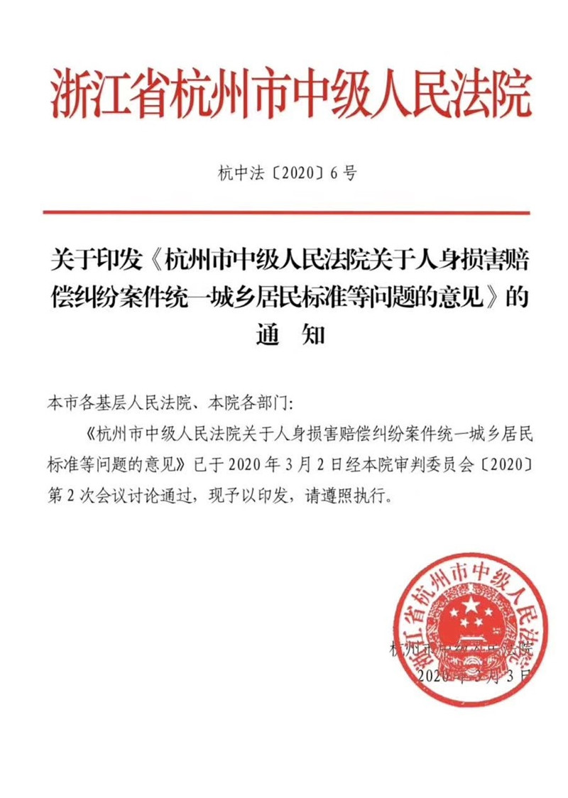 杭州市中级人民法院关于人身损害赔偿纠纷案件统一城乡居民标准等问题的意见  杭中法【2020】6号。