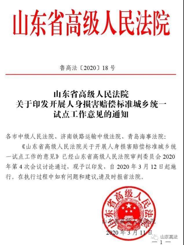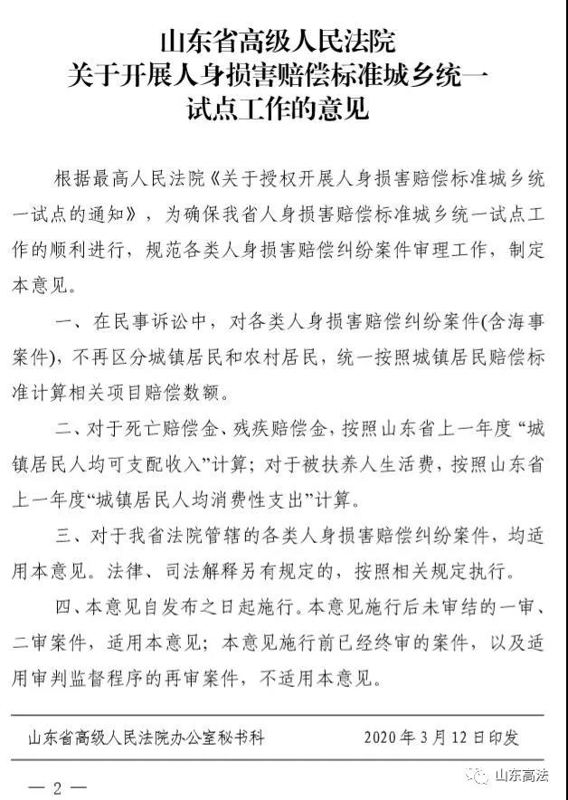 2020年3月12日起,山东高院关于开展人身损害赔偿标准城乡统一试点工作的意见统一适用,将不再区分城镇、农村标准,统一按城镇标准计算残疾赔偿金、死亡赔偿金