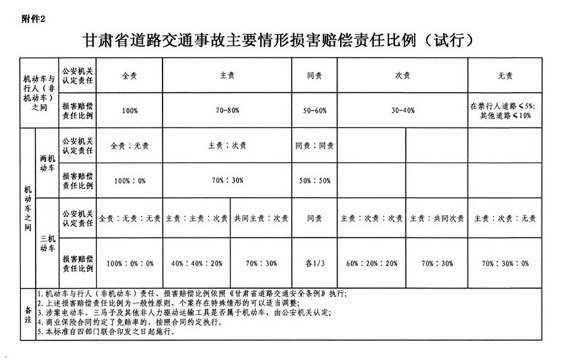 《甘肃省道路交通事故主要情形损害赔偿责任比例(试行)》的通知