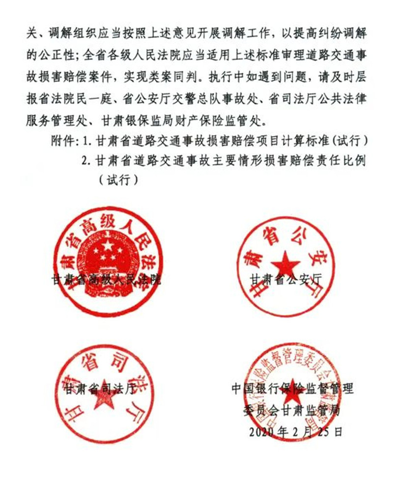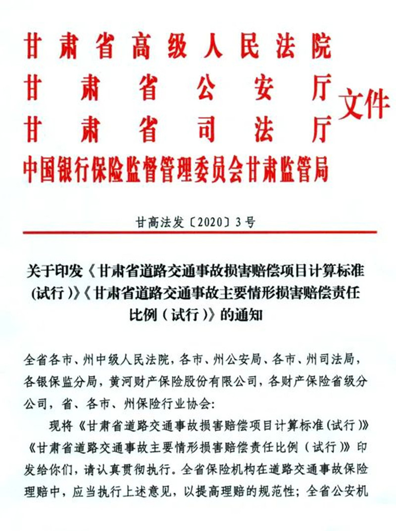 2020年甘肃高院等四部门关于印发《甘肃省道路交通事故损害赔偿项目计算标准(试行)》