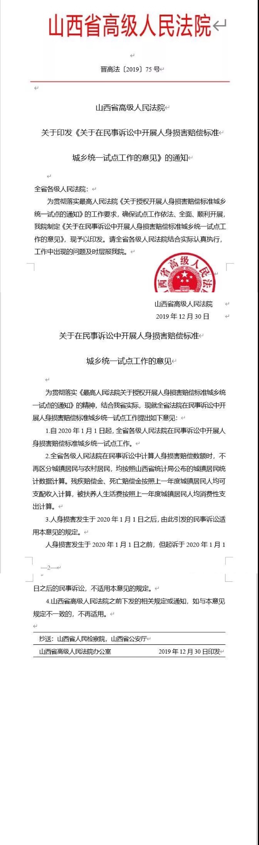 山西省高级人民法院关于印发《关于在民事诉讼中开展人身损害赔偿标准城乡统一试点工作的意见》的通知