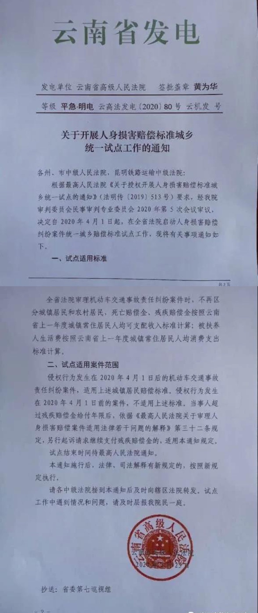 云南省高级人民法院《关于开展人身损害赔偿标准城乡统一试点工作的通知》