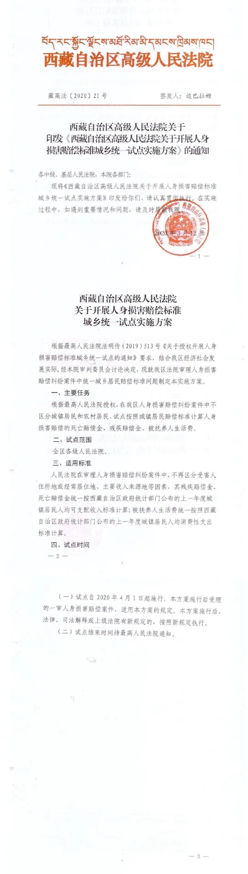 西藏自治区高级人民法院关于印发《西藏自治区高级人民法院关于开展人身损害赔偿标准城乡统一试点实施方案》的通知