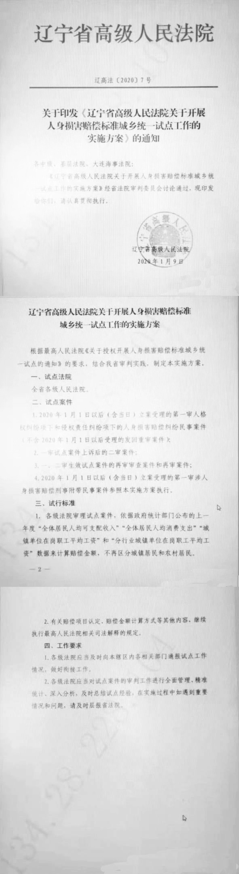 辽宁省高级人民法院关于印发《辽宁省高级人民法院关于开展人身损害赔偿标准城乡统一试点工作的实施方案》的通知
