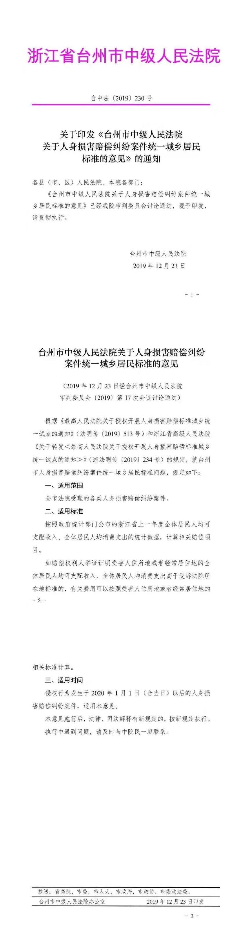 关于印发《台州市中级人民法院关于人身损害赔偿纠纷案件统一城乡居民标准的意见》的通知